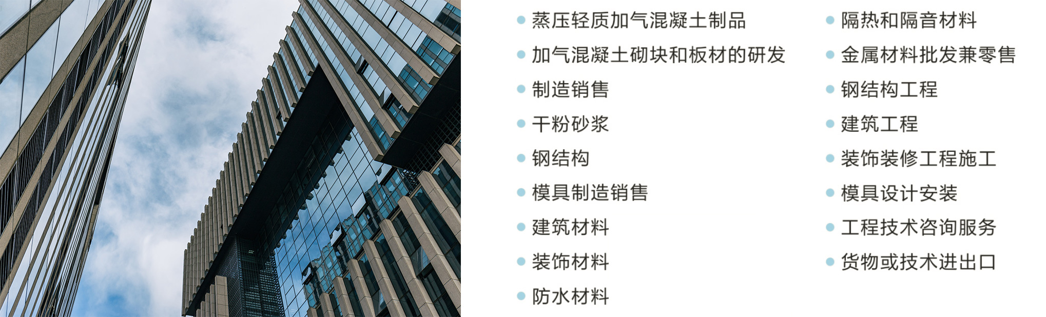公司服务范围有:蒸压轻质加气混凝土制品、加气混凝土砌块和板材的研发、制造、销售,干粉砂浆、钢结构、模具制造、销售;建筑材料(不含化学危险品)、装饰材料(不含化学危险品)、防水材料、隔热和隔音材料、金属材料批发兼零售;钢结构工程、建筑工程、装饰装修工程施工;模具设计、安装;工程技术咨询服务,货物或技术进出口(国家禁止或涉及行政审批的货物和技术进出口除外)(涉及许可经营项目,应取得相关部门许可后方可经营)。